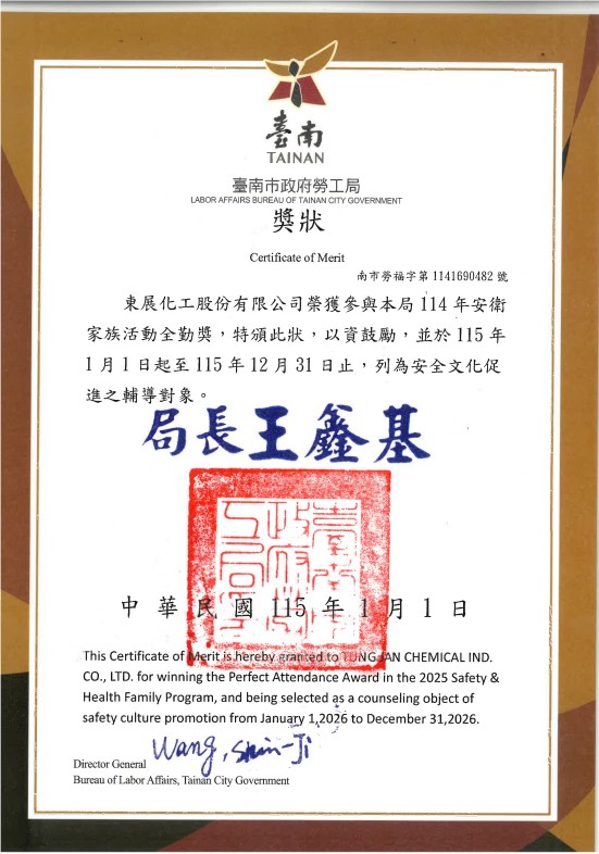 本公司積極參加台南市政府勞工局舉辦的各項輔導活動,榮獲109年度~111年度安衛家族文化全勤獎,列為安全文化促進之輔導對象,亦參加112年度的「安全文化促進輔導」、獲得「健康職場認證標章」。另外,在衛生福利部國民健康署舉辦的職場煙害防制暨健康促進計畫中,也榮獲健康職場認證─健康啟動標章。