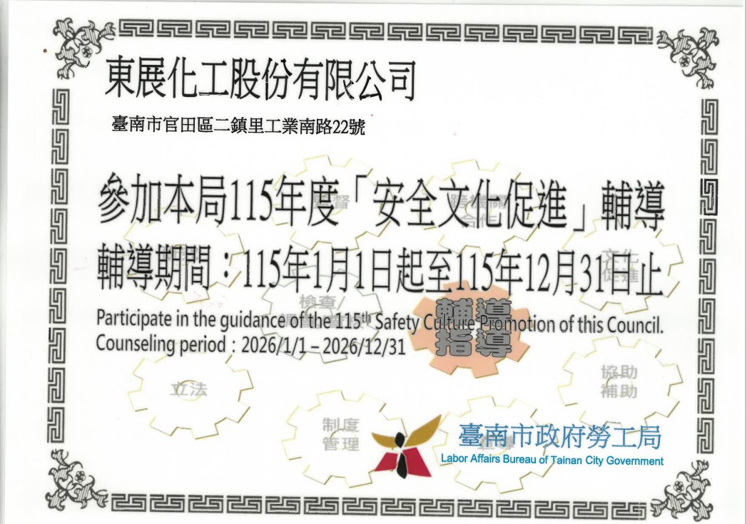 東展化工股份有限公司基於對品質的保證,於2021年取得ISO 9001品質管理系統、ISO14001環境管理系統、ISO45001職業安全衛生管理三項認證審核全數通過,廠內員工也進行上述三項管理系統內部稽核訓練課程。